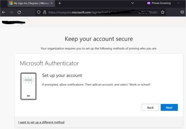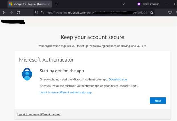 2. Eenmaal ingelogd verschijnt onderstaande mededeling dat er meer informatie is vereist. Druk op Next of Volgende
